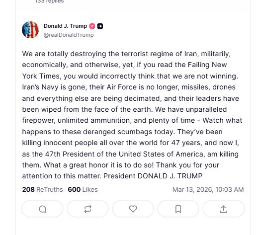 “We have unparalleled firepower, unlimited ammunition, and plenty of time. Watch what happens to these deranged scumbags today. They’ve been killing innocent people all over the world for 47 years, and now I, as the 47th President of the United States of America, am killing them. What a great honor it is to do so!"