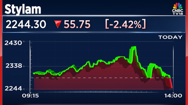 The shares of Stylam Industries have taken a hit and have seen a sharp decline. At the time of writing, the company shares declined by 2.42% or ₹55.75. The current share price stands at ₹2244.30 per share.