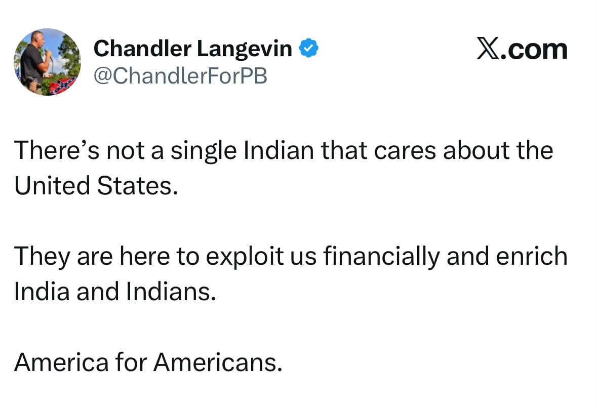 Langevin has posted at least five derogatory remarks since mid-September, including one in which he accused Indians of “destroying the South." He also shared a post from the Department of Homeland Security about an Indian truck driver who killed a woman after an illegal U-turn, saying, “Deport every Indian immediately."