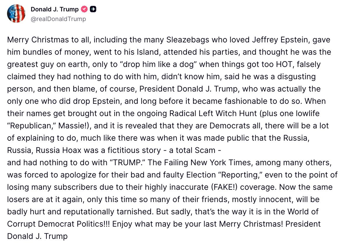 US President Donald Trump issued a combative Christmas message on his social media platform, Truth Social, launching a sweeping attack on political rivals, media organisations and individuals he claims were associated with convicted sex offender Jeffrey Epstein.