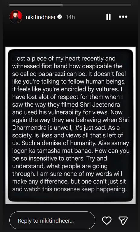 Taking to his social media account, Nikitin wrote, “I lost a piece of my heart recently and witnessed first hand how despicable the so called paparazzi can be. It doesn't feel like you're talking to fellow human beings, it feels like you're encircled by vultures.” He added “I have lost a lot of respect for them when I saw the way they filmed Shri Jeetendra and used his vulnerability for views. Now again the way they are behaving when Shri Dharmendra is unwell, it's just sad. As a society, is likes and views all that's left of us. Such a demise of humanity.” He further added, “Aise samay logon ka tamasha mat banao. How can you be so insensitive to others. Try and understand, what people are going through. I am sure none of my words will make any difference, but one can't just sit and watch this nonsense keep happening.”