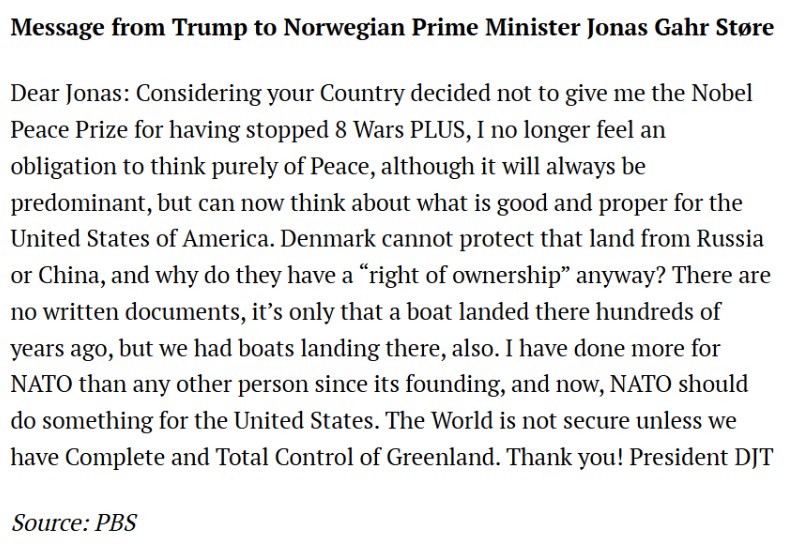 In the message addressed to Støre, Trump linked Norway’s role in hosting the Nobel Peace Prize to his broader foreign policy views and security demands.