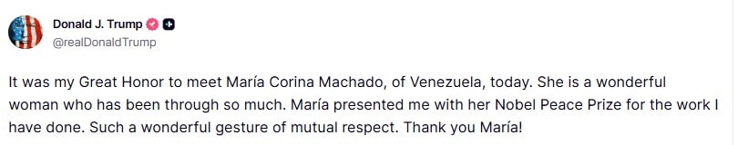 “It was my Great Honor to meet María Corina Machado, of Venezuela, today. She is a wonderful woman who has been through so much. María presented me with her Nobel Peace Prize for the work I have done. Such a wonderful gesture of mutual respect. Thank you María!" Trump later said on Truth Social.