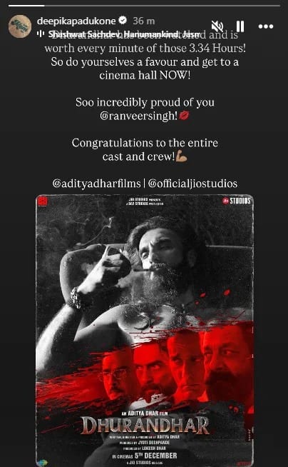 Deepika's social media note read, "Dhurandhar has been watched and is worth every minute of those 3.34 Hours! So do yourselves a favour and get to a cinema hall NOW! Soo incredibly proud of you ranveersingh! Congratulations to the entire cast and crew! @adityadharfilms | @officialjiostudios (sic)".