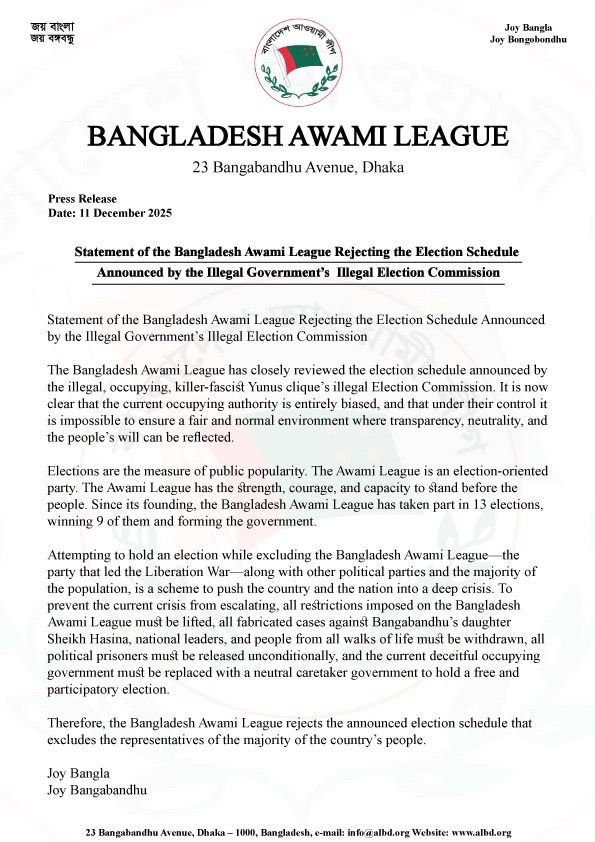 In the formal declaration released from its headquarters at 23 Bangabandhu Avenue in Dhaka, the party said it had “closely reviewed the election schedule announced by the illegal, occupying, killer-fascist Yunus clique’s illegal Election Commission".