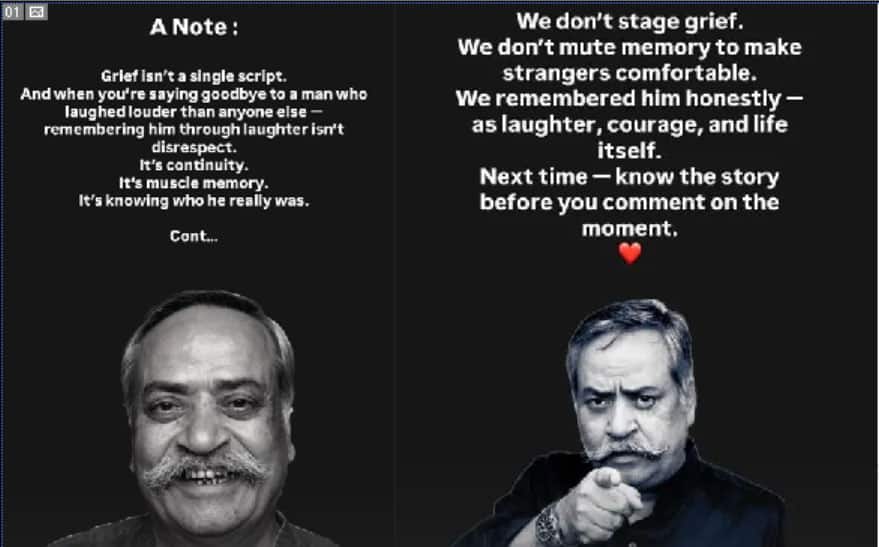 "We don't stage grief. We don't mute memory to make strangers comfortable. We remembered him honestly -as laughter, courage, and life itself. Next time - know the story before you comment on the moment," read another Story.