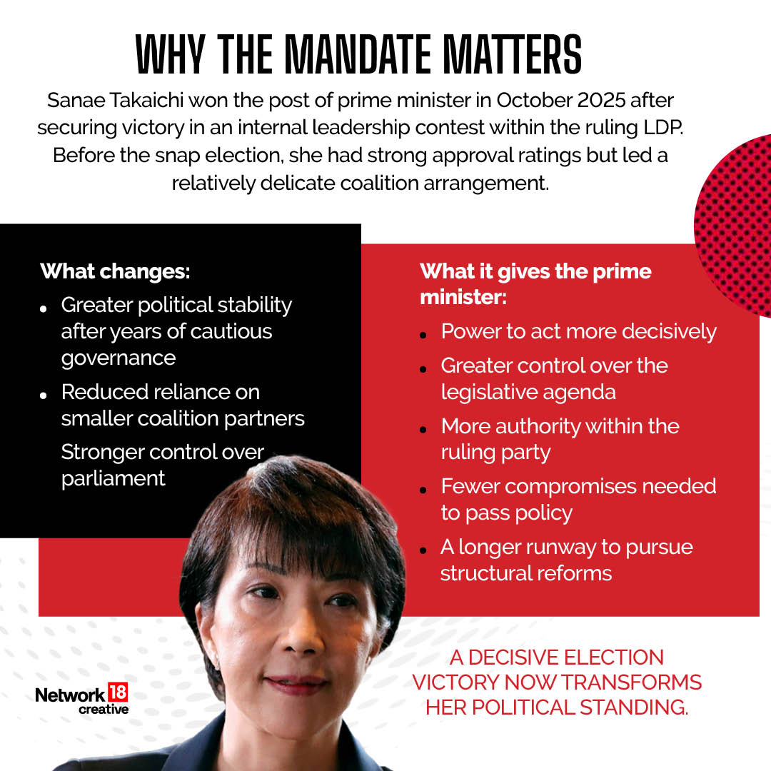 This win will grant PM Takaichi more control over the legislative agenda while reducing reliance on smaller coalition partners. (Network18)