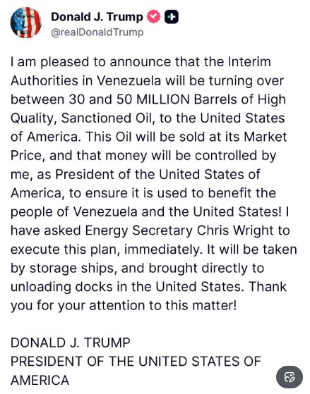 “This Oil will be sold at its market price, and that money will be controlled by me, as President of the United States of America, to ensure it is used to benefit the people of Venezuela and the United States!" Trump mentioned.