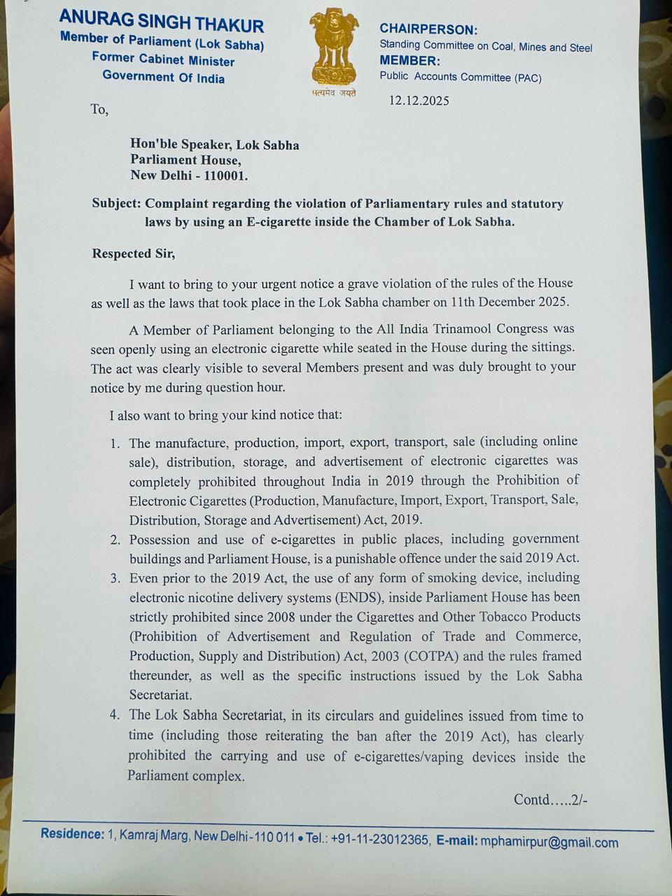 Thakur’s complaint said: “I want to bring to your urgent notice a grave violation of the rules of the House as well as the laws that took place in the Lok Sabha chamber on 11th December 2025. A Member of Parliament belonging to the All India Trinamool Congress was seen openly using an electronic cigarette while seated in the House during the sittings. The act was clearly visible to several Members present and was duly brought to your notice by me during question hour."