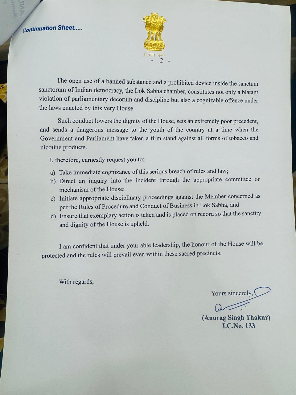 “The Lok Sabha Secretariat, in its circulars and guidelines issued from time to time (including those reiterating the ban after the 2019 Act), has clearly prohibited the carrying and use of e-cigarettes/vaping devices inside the Parliament complex. The open use of a banned substance and a prohibited device inside the sanctum sanctorum of Indian democracy, the Lok Sabha chamber, constitutes not only a blatant violation of parliamentary decorum and discipline but also a cognizable offence under the laws enacted by this very House," said the complaint.