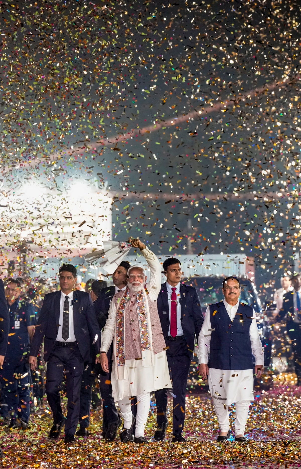 बिहार चुनाव 2025 में निर्णायक जीत दर्ज करने के बाद दिल्ली स्थित बीजेपी हेडक्वार्टर्स में पीएम नरेंद्र मोदी का जोरदार स्वागत किया गया. (Photo : PTI)